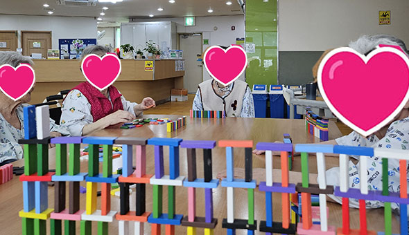 개인마다 인지능력이 다르기 때문에 여러 난이도의 활동을 준비하여 개인에게 맞는 프로그램을 개발 및 적용하여 뇌의 활동에 도움을 줄 수 있습니다. 도미노게임은 무언가를 쌓고 무너뜨리는 과정에서 손과 눈의 협응과 함께 집중이 많이 필요한 활동으로 치매예방 활동에 많은 도움을 준다 |
