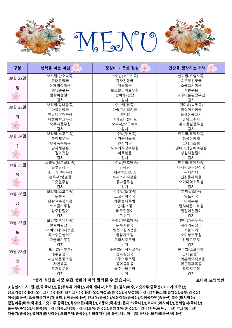 9월 22일~9월 28일 식단표 페이지 정보 작성자 효다움요양병원 댓글 댓글 0건 조회Hit 100회 작성일Date 25-09-19 12:39 본문 . 목록 답변 이전글9월 29일~10월 5일 식단표 25.09.26 다음글9월 15일~9월 21일 식단표 25.09.12 댓글 0 댓글목록 등록된 댓글이 없습니다.